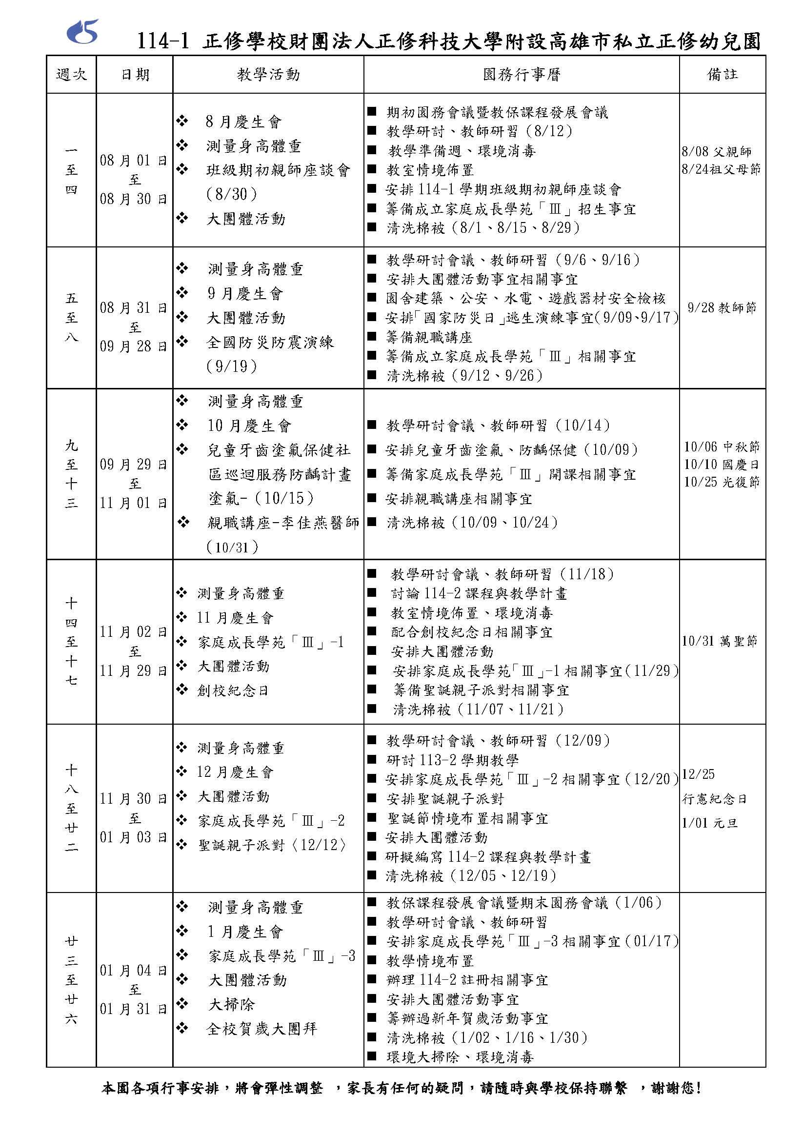 114-1 行事曆